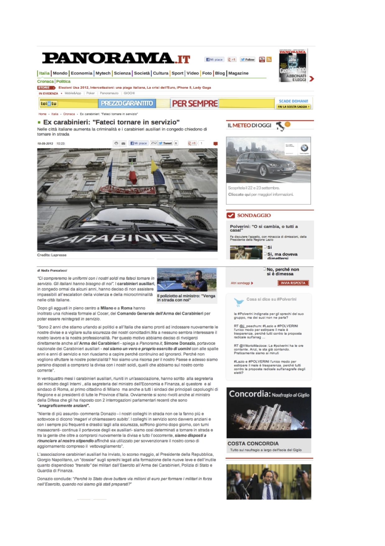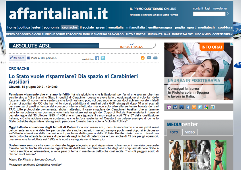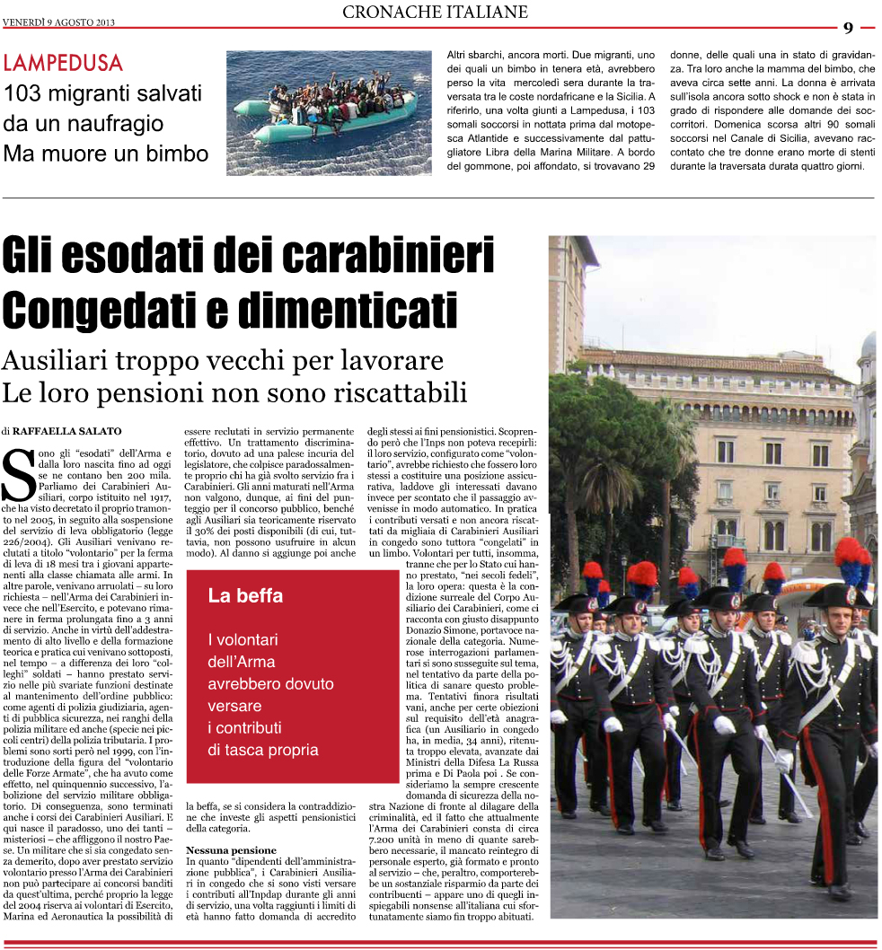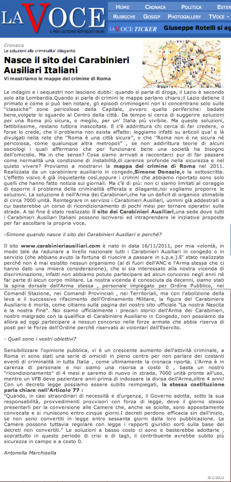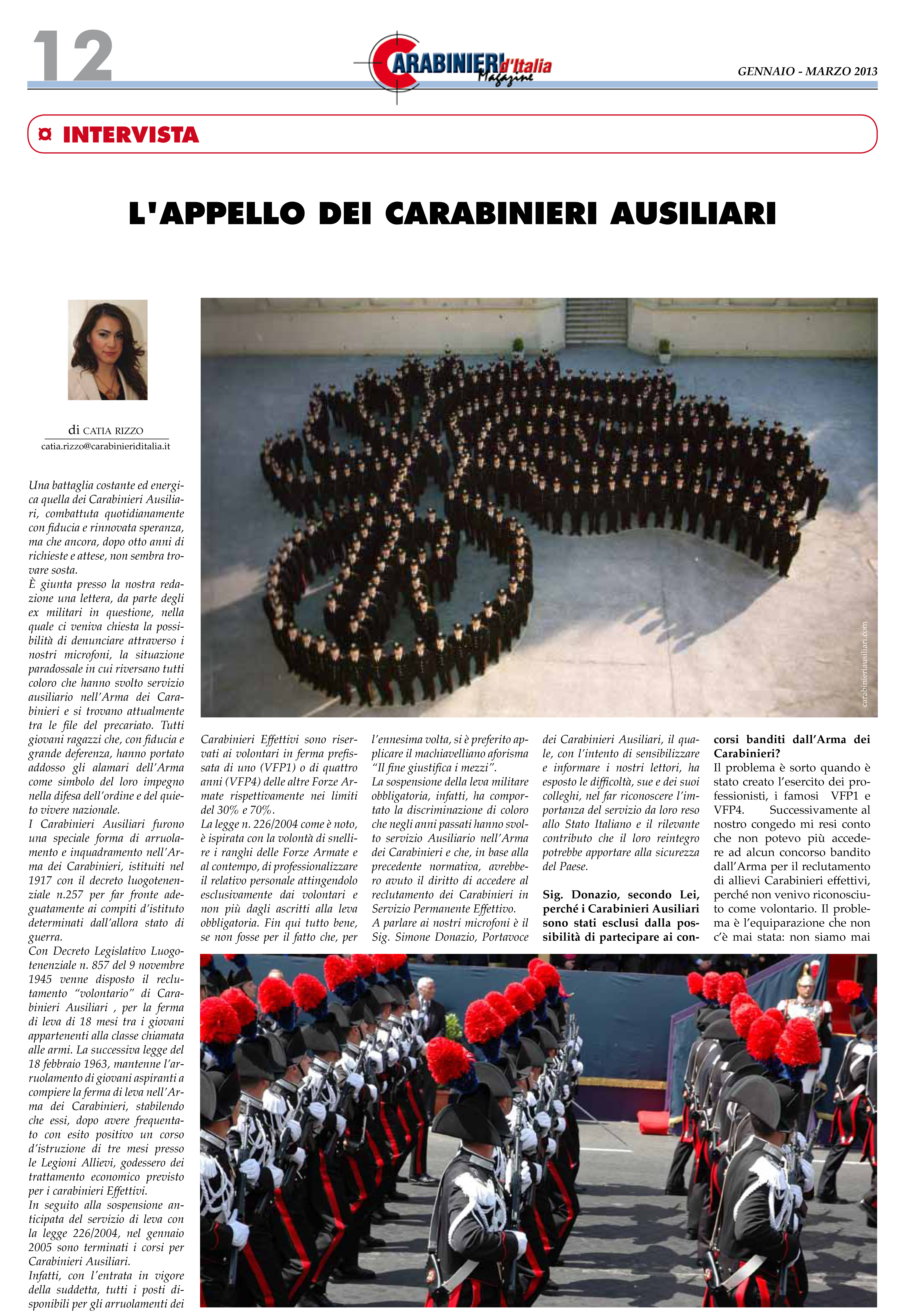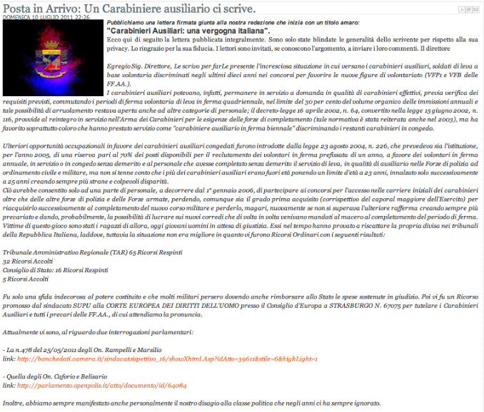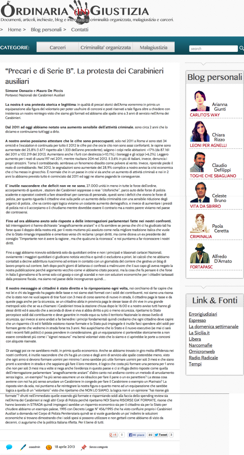 Molteplici sono le iniziative intraprese dai carabinieri ausiliari a livello giornalistico, si cominciò con PANORAMA denunciando la situazione sia di precarietà sia dei contributi non riscattati, in seguito uscì su J’ACCUSE una lettera firmata di un Carabiniere Ausiliario in Congedo, successivamente il GIORNALE DI RIETI ha postato un articolo denuncia sulla situazione in cui versano i Carabinieri Ausiliari, stessa cosa ha fatto VOCEDITALIA sul suo sito online per ben 2 volte intervistando ultimamente anche il creatore e amministratore di questo sito , e lo stesso settimanale PANORAMA è tornato a parlare dei Carabinieri Ausiliari postando questo sito internet. Di seguito anche i siti “WWW.LAVOCEDELL’INFORMAZIONE.IT“, “WWW.FORZEARMATE.ORG“, “WWW.SICUREZZAPUBBLICA.COM“, “WWW.SOSTENITORI.INFO“, “WWW.CRONACHEMACERATESI.IT” e “WWW.DIPENDENTISTATALI.ORG” (http://www.dipendentistatali.org per ben 2 volte ci ha intervistato) dedicano una pagina alla nostra causa, a dimostrazione che pian piano anche la stampa sta prendendo coscienza della problematica, come anche il Corriere della Sera pone la questione “Carenza in Organico” dichiarata il 04-01-2012 dal Vice Capo della Polizia di Stato Dott. Cirillo in audizione alla commissione Giustizia in Senato. In data 12-02-2012 lo Scrittore e Carabiniere Ausiliario in Congedo già registrato nell’elenco nazionale del nostro sito Alessio Puleo, noto per il suo libro “LA MAMMA DEI CARABINIERI“, rilascia a “Voce d’Italia” un’intervista proprio nei riguardi dei Carabinieri Ausiliari dimostrando la sua dedizione all’Arma che contraddistingue ogni Carabiniere sia in Servizio che in Congedo, il nostro sito ringrazia lo Scrittore per aver appoggiato la nostra causa a nome di tutti i Carabinieri Ausiliari d’Italia, in data 07-04-2012 la Giornalista Antonella Marchisella pubblica un ennesimo articolo a favore dei Carabinieri Ausiliari e della loro petizione online, il nostro sito ringrazia la Giornalista per aver dato voce alla nostra causa nuovamente tramite VOCEDITALIA, in data 10-05-2012 il Giornalista Lorenzo Lamperti pubblica su AFFARI ITALIANI un intervista-denuncia in merito alla nostra situazione il nostro sito ringrazia il sig. Lamperti per il suo contributo alla nostra causa. Di seguito ringraziamo la Dott.ssa Nadia Francalacci per aver fatto uscire su PANORAMA.IT il 18-09-2012 un articolo relativo alla nostra proposta-denuncia. Di seguito ringraziamo IMOLAOGGI e in particolare il direttore Manocchia Armando per l’articolo pubblicato a nostro favore in data 08-02-2013, ringraziamo anche ROMACAPITALEMAGAZINE e il direttore Frattaroli Emiliano per aver pubblicato in data 18-02-2013 una lunga intervista al nostro portavoce nazionale che ha descritto il nostro stato di abbandono. Grazie anche a MILANOPOST in particolare al direttore Salvatore Todaro che in data 03-03-2013 ha pubblicato una lunga intervista ad uno dei nostri due portavoce nazionali. Come ringraziamo Carabinieri d’Italia Magazine e la giornalista Catia Rizzo che nel mese di marzo 2013 ha pubblicato un intervista ad uno dei nostri due portavoce, di seguito si ringrazia ORDINARIAINGIUSTIZIA.IT per averci pubblicato, il direttore Riccardo Castagneri di ARTICOLOTRE.COM per il suo ultimo articolo del 17-06-2013 e il Giornalista e Scrittore Pietrangelo Buttafuoco per aver dedicato il 28-06-2013 un riempitivo nei nostri confronti sul FOGLIO.IT , in data 30-06-2013 ringraziamo Il Direttore di DONNAMANAGERDINAPOLI pubblica il nostro appello, idem facciamo con OGGI.IT che grazie al suo Direttore ha raccolto il nostro appello in data 04-07-2013, come ringraziamo Maurizio Belpietro Direttore di LIBERO QUOTIDIANO per aver raccolto e prontamente pubblicato il nostro appello in data 07-07-2013. In data 12-07-2013 andiamo a ringraziare la Professionalità di Ermanno Amedei direttore de ILPUNTOAMEZZOGIORNO.IT che ha pubblicato la nostra missiva, stessi ringraziamenti vanno a Giorgio Bongiovanni di ANTIMAFIADUEMILA.IT che pubblica una nostra ennesima missiva in data 23-07-2013. Mentre OGGI TREVISO in data 30-07-2013 pubblica una nostra ennesima missiva ringraziandoli per lo spazio concessoci, il 02-08-2013 il dott. Riccardo Ghezzi su QELSI.IT ci concede una lunga e interessante intervista. Mentre in data 07-08-2013 LETTERA43.IT rilascia un intervista con speciale su di noi ringraziamo vivamente, come ringraziamo vivamente LANOTIZIAILGIORNALE.IT che il 09-08-2013 fa pubblicare una nostra intervista rendendola cartacea, come cartaceo è l’articolo su di noi del GIORNALE D’ITALIA che il 22-08-2013 ci dedica un intera pagina ringraziamo Francesco Storace in qualità del direttore del quotidiano, ringraziamo anche IL BORGHESE per averci concesso spazio ed averci pubblicato nel trimestre Ottobre-Novembre-Dicembre grazie al direttore Tedeschi e la Giornalista Mary Pace. Mentre dopo PANORAMA.IT in data 18-10-2013 ritorniamo a far parlare della nostra problematica a livello nazionale su REPUBBLICA.IT grazie all’ottima inchiesta condotta dal Giornalista Fabio Tonacci che con un video e 3 articoli di inchieste in merito ha portato alla luce la gravosa condizione nella quale siamo finiti da anni, da parte nostra un sentito ringraziamento. In Data 29-01-2014 siamo stati invece pubblicati dal settimanale CRONACA VERA e ringraziamo il Giornalista Ermanno Amedei per il servizio su di noi. In Data 05-03-2014 torniamo a ringraziare il Primo Quotidiano Online d’Italia AFFARI ITALIANI che ha pubblicato la notizia con intervista in merito alle nostre 2 petizioni presentate alla Camera e al Senato, ringraziamo il Giornalista Lorenzo Lamperti per la professionalità dimostrata.