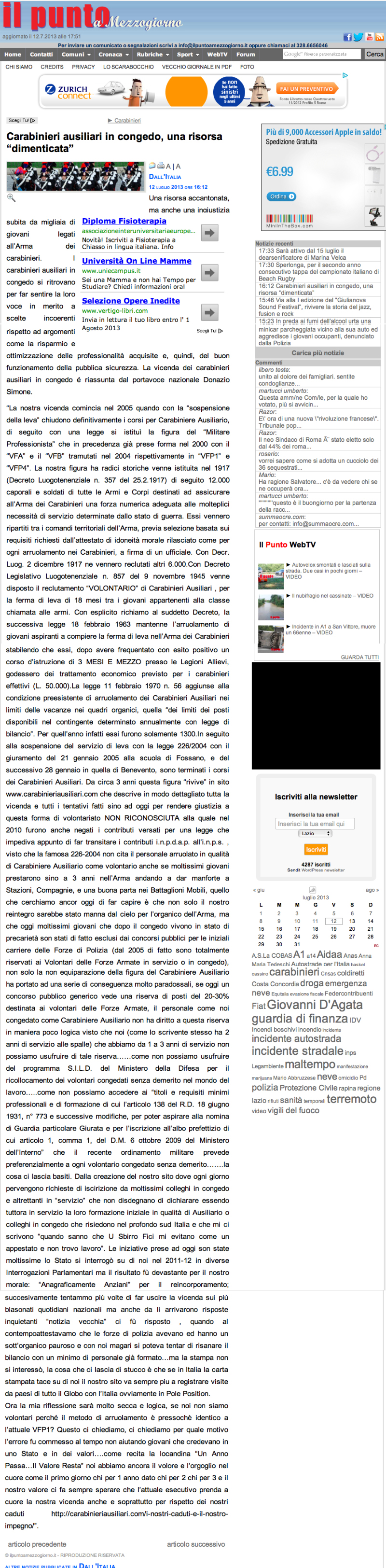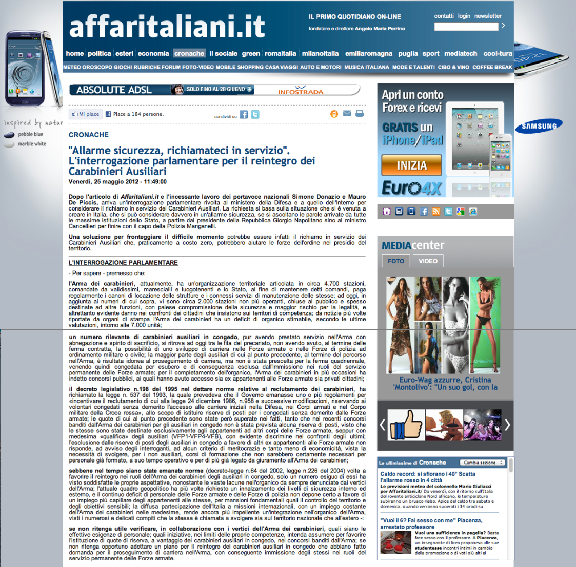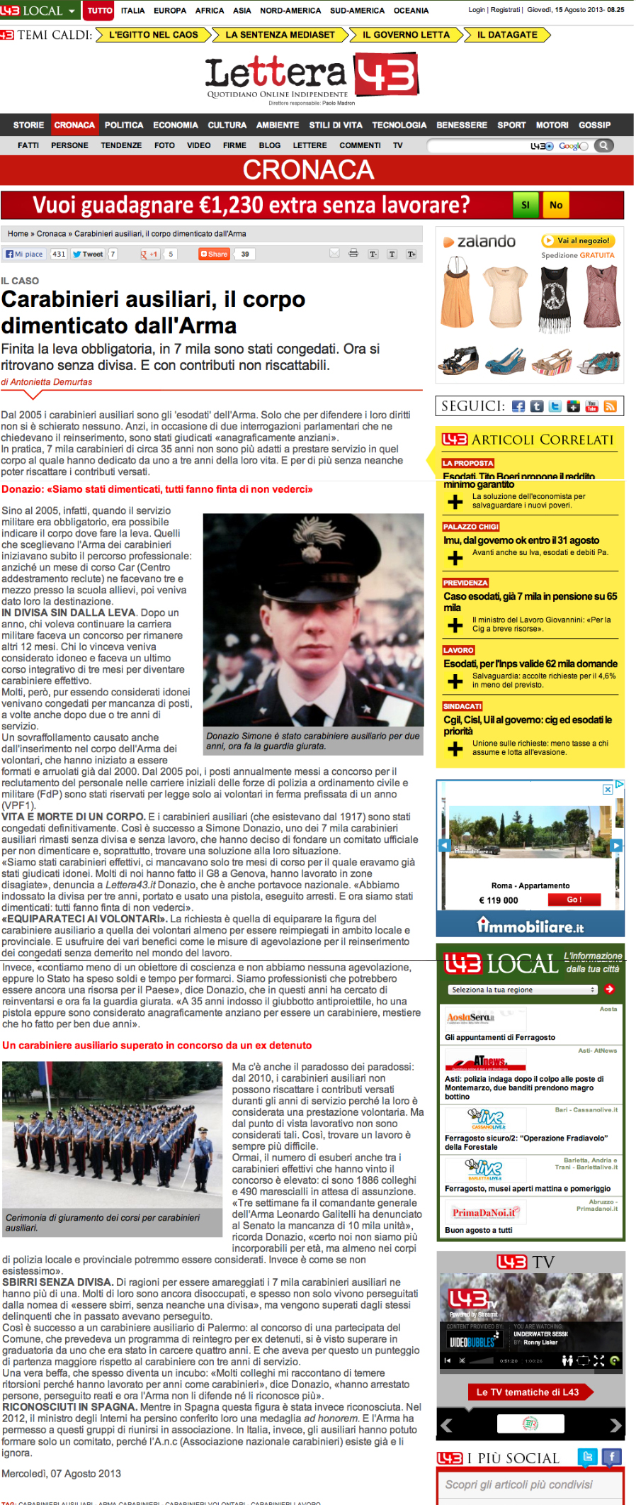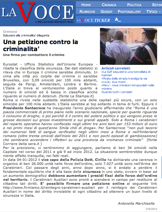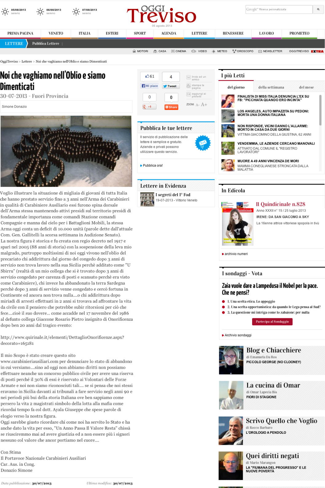 Molteplici sono le iniziative intraprese dai carabinieri ausiliari a livello giornalistico, si cominciò con PANORAMA denunciando la situazione sia di precarietà sia dei contributi non riscattati, in seguito uscì su J’ACCUSE una lettera firmata di un Carabiniere Ausiliario in Congedo, successivamente il GIORNALE DI RIETI ha postato un articolo denuncia sulla situazione in cui versano i Carabinieri Ausiliari, stessa cosa ha fatto VOCEDITALIA sul suo sito online per ben 2 volte intervistando ultimamente anche il creatore e amministratore di questo sito , e lo stesso settimanale PANORAMA è tornato a parlare dei Carabinieri Ausiliari postando questo sito internet. Di seguito anche i siti “WWW.LAVOCEDELL’INFORMAZIONE.IT“, “WWW.FORZEARMATE.ORG“, “WWW.SICUREZZAPUBBLICA.COM“, “WWW.SOSTENITORI.INFO“, “WWW.CRONACHEMACERATESI.IT” e “WWW.DIPENDENTISTATALI.ORG” (http://www.dipendentistatali.org per ben 2 volte ci ha intervistato) dedicano una pagina alla nostra causa, a dimostrazione che pian piano anche la stampa sta prendendo coscienza della problematica, come anche il Corriere della Sera pone la questione “Carenza in Organico” dichiarata il 04-01-2012 dal Vice Capo della Polizia di Stato Dott. Cirillo in audizione alla commissione Giustizia in Senato. In data 12-02-2012 lo Scrittore e Carabiniere Ausiliario in Congedo già registrato nell’elenco nazionale del nostro sito Alessio Puleo, noto per il suo libro “LA MAMMA DEI CARABINIERI“, rilascia a “Voce d’Italia” un’intervista proprio nei riguardi dei Carabinieri Ausiliari dimostrando la sua dedizione all’Arma che contraddistingue ogni Carabiniere sia in Servizio che in Congedo, il nostro sito ringrazia lo Scrittore per aver appoggiato la nostra causa a nome di tutti i Carabinieri Ausiliari d’Italia, in data 07-04-2012 la Giornalista Antonella Marchisella pubblica un ennesimo articolo a favore dei Carabinieri Ausiliari e della loro petizione online, il nostro sito ringrazia la Giornalista per aver dato voce alla nostra causa nuovamente tramite VOCEDITALIA, in data 10-05-2012 il Giornalista Lorenzo Lamperti pubblica su AFFARI ITALIANI un intervista-denuncia in merito alla nostra situazione il nostro sito ringrazia il sig. Lamperti per il suo contributo alla nostra causa. Di seguito ringraziamo la Dott.ssa Nadia Francalacci per aver fatto uscire su PANORAMA.IT il 18-09-2012 un articolo relativo alla nostra proposta-denuncia. Di seguito ringraziamo IMOLAOGGI e in particolare il direttore Manocchia Armando per l’articolo pubblicato a nostro favore in data 08-02-2013, ringraziamo anche ROMACAPITALEMAGAZINE e il direttore Frattaroli Emiliano per aver pubblicato in data 18-02-2013 una lunga intervista al nostro portavoce nazionale che ha descritto il nostro stato di abbandono. Grazie anche a MILANOPOST in particolare al direttore Salvatore Todaro che in data 03-03-2013 ha pubblicato una lunga intervista ad uno dei nostri due portavoce nazionali. Come ringraziamo Carabinieri d’Italia Magazine e la giornalista Catia Rizzo che nel mese di marzo 2013 ha pubblicato un intervista ad uno dei nostri due portavoce, di seguito si ringrazia ORDINARIAINGIUSTIZIA.IT per averci pubblicato, il direttore Riccardo Castagneri di ARTICOLOTRE.COM per il suo ultimo articolo del 17-06-2013 e il Giornalista e Scrittore Pietrangelo Buttafuoco per aver dedicato il 28-06-2013 un riempitivo nei nostri confronti sul FOGLIO.IT , in data 30-06-2013 ringraziamo Il Direttore di DONNAMANAGERDINAPOLI pubblica il nostro appello, idem facciamo con OGGI.IT che grazie al suo Direttore ha raccolto il nostro appello in data 04-07-2013, come ringraziamo Maurizio Belpietro Direttore di LIBERO QUOTIDIANO per aver raccolto e prontamente pubblicato il nostro appello in data 07-07-2013. In data 12-07-2013 andiamo a ringraziare la Professionalità di Ermanno Amedei direttore de ILPUNTOAMEZZOGIORNO.IT che ha pubblicato la nostra missiva, stessi ringraziamenti vanno a Giorgio Bongiovanni di ANTIMAFIADUEMILA.IT che pubblica una nostra ennesima missiva in data 23-07-2013. Mentre OGGI TREVISO in data 30-07-2013 pubblica una nostra ennesima missiva ringraziandoli per lo spazio concessoci, il 02-08-2013 il dott. Riccardo Ghezzi su QELSI.IT ci concede una lunga e interessante intervista. Mentre in data 07-08-2013 LETTERA43.IT rilascia un intervista con speciale su di noi ringraziamo vivamente, come ringraziamo vivamente LANOTIZIAILGIORNALE.IT che il 09-08-2013 fa pubblicare una nostra intervista rendendola cartacea, come cartaceo è l’articolo su di noi del GIORNALE D’ITALIA che il 22-08-2013 ci dedica un intera pagina ringraziamo Francesco Storace in qualità del direttore del quotidiano, ringraziamo anche IL BORGHESE per averci concesso spazio ed averci pubblicato nel trimestre Ottobre-Novembre-Dicembre grazie al direttore Tedeschi e la Giornalista Mary Pace. Mentre dopo PANORAMA.IT in data 18-10-2013 ritorniamo a far parlare della nostra problematica a livello nazionale su REPUBBLICA.IT grazie all’ottima inchiesta condotta dal Giornalista Fabio Tonacci che con un video e 3 articoli di inchieste in merito ha portato alla luce la gravosa condizione nella quale siamo finiti da anni, da parte nostra un sentito ringraziamento. In Data 29-01-2014 siamo stati invece pubblicati dal settimanale CRONACA VERA e ringraziamo il Giornalista Ermanno Amedei per il servizio su di noi. In Data 05-03-2014 torniamo a ringraziare il Primo Quotidiano Online d’Italia AFFARI ITALIANI che ha pubblicato la notizia con intervista in merito alle nostre 2 petizioni presentate alla Camera e al Senato, ringraziamo il Giornalista Lorenzo Lamperti per la professionalità dimostrata.
