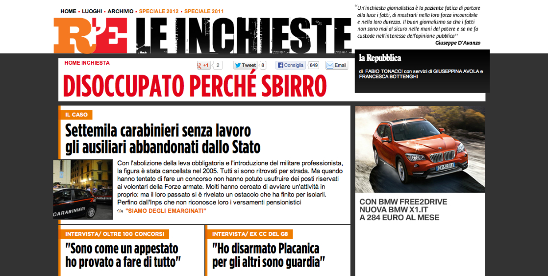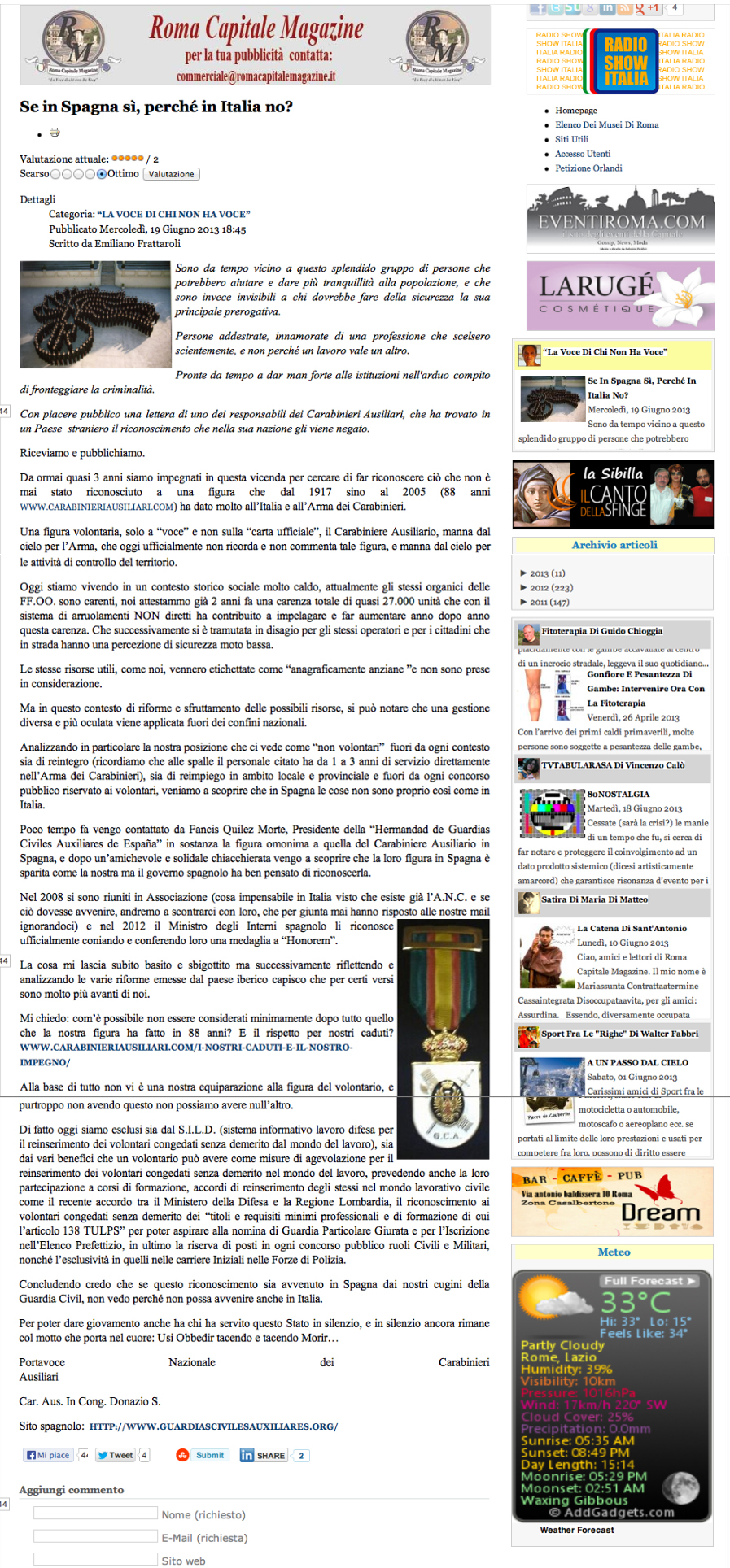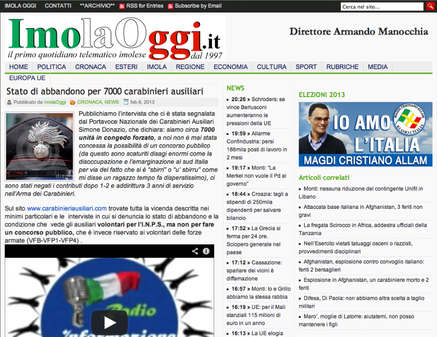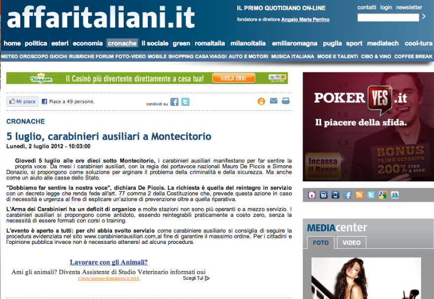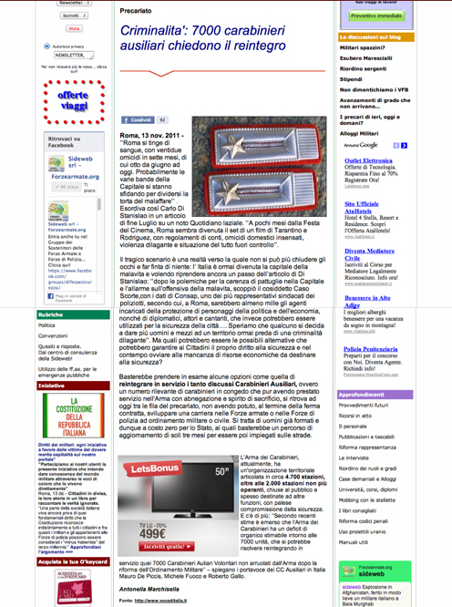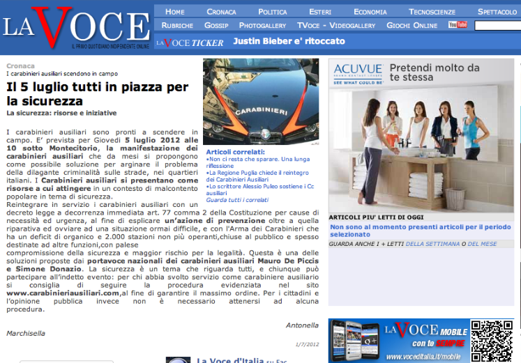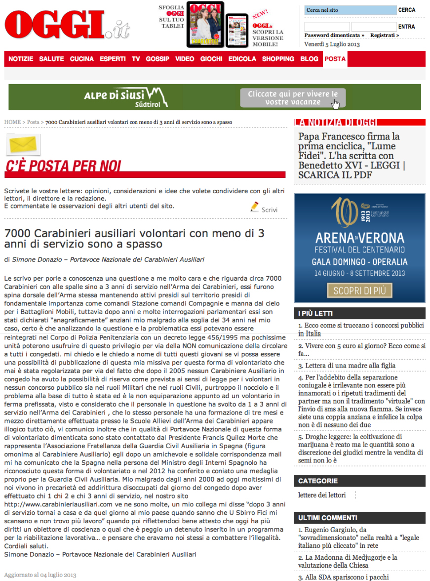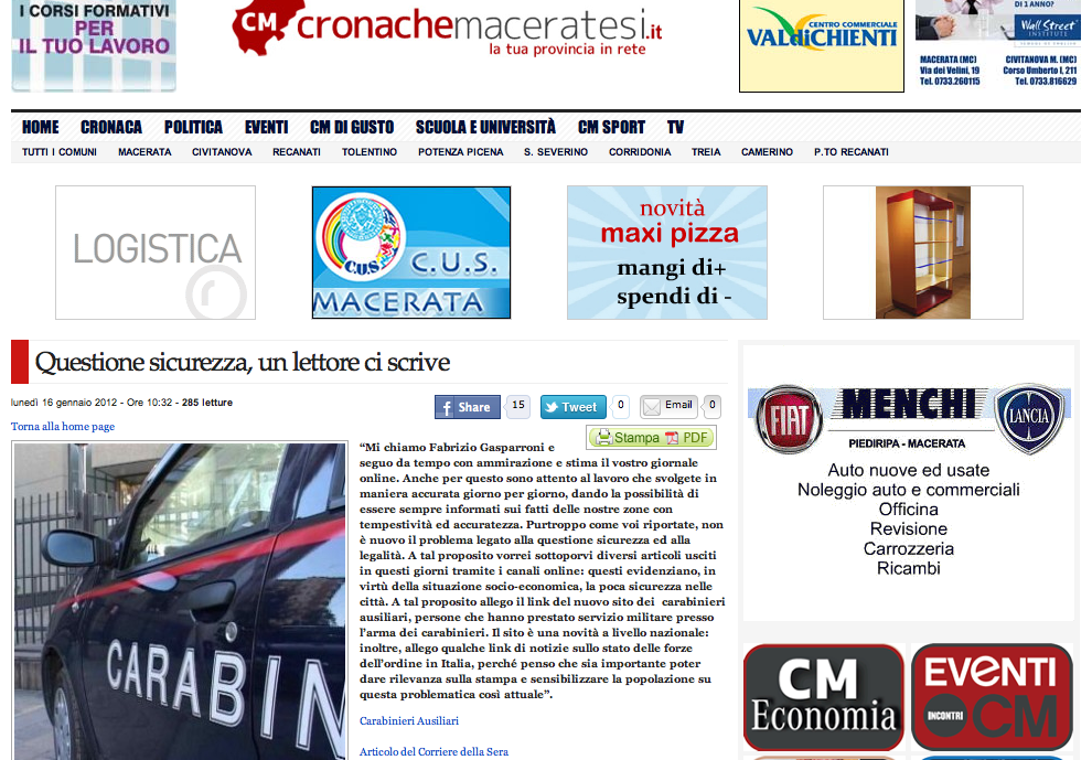 Molteplici sono le iniziative intraprese dai carabinieri ausiliari a livello giornalistico, si cominciò con PANORAMA denunciando la situazione sia di precarietà sia dei contributi non riscattati, in seguito uscì su J’ACCUSE una lettera firmata di un Carabiniere Ausiliario in Congedo, successivamente il GIORNALE DI RIETI ha postato un articolo denuncia sulla situazione in cui versano i Carabinieri Ausiliari, stessa cosa ha fatto VOCEDITALIA sul suo sito online per ben 2 volte intervistando ultimamente anche il creatore e amministratore di questo sito , e lo stesso settimanale PANORAMA è tornato a parlare dei Carabinieri Ausiliari postando questo sito internet. Di seguito anche i siti “WWW.LAVOCEDELL’INFORMAZIONE.IT“, “WWW.FORZEARMATE.ORG“, “WWW.SICUREZZAPUBBLICA.COM“, “WWW.SOSTENITORI.INFO“, “WWW.CRONACHEMACERATESI.IT” e “WWW.DIPENDENTISTATALI.ORG” (http://www.dipendentistatali.org per ben 2 volte ci ha intervistato) dedicano una pagina alla nostra causa, a dimostrazione che pian piano anche la stampa sta prendendo coscienza della problematica, come anche il Corriere della Sera pone la questione “Carenza in Organico” dichiarata il 04-01-2012 dal Vice Capo della Polizia di Stato Dott. Cirillo in audizione alla commissione Giustizia in Senato. In data 12-02-2012 lo Scrittore e Carabiniere Ausiliario in Congedo già registrato nell’elenco nazionale del nostro sito Alessio Puleo, noto per il suo libro “LA MAMMA DEI CARABINIERI“, rilascia a “Voce d’Italia” un’intervista proprio nei riguardi dei Carabinieri Ausiliari dimostrando la sua dedizione all’Arma che contraddistingue ogni Carabiniere sia in Servizio che in Congedo, il nostro sito ringrazia lo Scrittore per aver appoggiato la nostra causa a nome di tutti i Carabinieri Ausiliari d’Italia, in data 07-04-2012 la Giornalista Antonella Marchisella pubblica un ennesimo articolo a favore dei Carabinieri Ausiliari e della loro petizione online, il nostro sito ringrazia la Giornalista per aver dato voce alla nostra causa nuovamente tramite VOCEDITALIA, in data 10-05-2012 il Giornalista Lorenzo Lamperti pubblica su AFFARI ITALIANI un intervista-denuncia in merito alla nostra situazione il nostro sito ringrazia il sig. Lamperti per il suo contributo alla nostra causa. Di seguito ringraziamo la Dott.ssa Nadia Francalacci per aver fatto uscire su PANORAMA.IT il 18-09-2012 un articolo relativo alla nostra proposta-denuncia. Di seguito ringraziamo IMOLAOGGI e in particolare il direttore Manocchia Armando per l’articolo pubblicato a nostro favore in data 08-02-2013, ringraziamo anche ROMACAPITALEMAGAZINE e il direttore Frattaroli Emiliano per aver pubblicato in data 18-02-2013 una lunga intervista al nostro portavoce nazionale che ha descritto il nostro stato di abbandono. Grazie anche a MILANOPOST in particolare al direttore Salvatore Todaro che in data 03-03-2013 ha pubblicato una lunga intervista ad uno dei nostri due portavoce nazionali. Come ringraziamo Carabinieri d’Italia Magazine e la giornalista Catia Rizzo che nel mese di marzo 2013 ha pubblicato un intervista ad uno dei nostri due portavoce, di seguito si ringrazia ORDINARIAINGIUSTIZIA.IT per averci pubblicato, il direttore Riccardo Castagneri di ARTICOLOTRE.COM per il suo ultimo articolo del 17-06-2013 e il Giornalista e Scrittore Pietrangelo Buttafuoco per aver dedicato il 28-06-2013 un riempitivo nei nostri confronti sul FOGLIO.IT , in data 30-06-2013 ringraziamo Il Direttore di DONNAMANAGERDINAPOLI pubblica il nostro appello, idem facciamo con OGGI.IT che grazie al suo Direttore ha raccolto il nostro appello in data 04-07-2013, come ringraziamo Maurizio Belpietro Direttore di LIBERO QUOTIDIANO per aver raccolto e prontamente pubblicato il nostro appello in data 07-07-2013. In data 12-07-2013 andiamo a ringraziare la Professionalità di Ermanno Amedei direttore de ILPUNTOAMEZZOGIORNO.IT che ha pubblicato la nostra missiva, stessi ringraziamenti vanno a Giorgio Bongiovanni di ANTIMAFIADUEMILA.IT che pubblica una nostra ennesima missiva in data 23-07-2013. Mentre OGGI TREVISO in data 30-07-2013 pubblica una nostra ennesima missiva ringraziandoli per lo spazio concessoci, il 02-08-2013 il dott. Riccardo Ghezzi su QELSI.IT ci concede una lunga e interessante intervista. Mentre in data 07-08-2013 LETTERA43.IT rilascia un intervista con speciale su di noi ringraziamo vivamente, come ringraziamo vivamente LANOTIZIAILGIORNALE.IT che il 09-08-2013 fa pubblicare una nostra intervista rendendola cartacea, come cartaceo è l’articolo su di noi del GIORNALE D’ITALIA che il 22-08-2013 ci dedica un intera pagina ringraziamo Francesco Storace in qualità del direttore del quotidiano, ringraziamo anche IL BORGHESE per averci concesso spazio ed averci pubblicato nel trimestre Ottobre-Novembre-Dicembre grazie al direttore Tedeschi e la Giornalista Mary Pace. Mentre dopo PANORAMA.IT in data 18-10-2013 ritorniamo a far parlare della nostra problematica a livello nazionale su REPUBBLICA.IT grazie all’ottima inchiesta condotta dal Giornalista Fabio Tonacci che con un video e 3 articoli di inchieste in merito ha portato alla luce la gravosa condizione nella quale siamo finiti da anni, da parte nostra un sentito ringraziamento. In Data 29-01-2014 siamo stati invece pubblicati dal settimanale CRONACA VERA e ringraziamo il Giornalista Ermanno Amedei per il servizio su di noi. In Data 05-03-2014 torniamo a ringraziare il Primo Quotidiano Online d’Italia AFFARI ITALIANI che ha pubblicato la notizia con intervista in merito alle nostre 2 petizioni presentate alla Camera e al Senato, ringraziamo il Giornalista Lorenzo Lamperti per la professionalità dimostrata.
