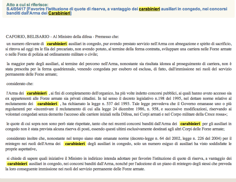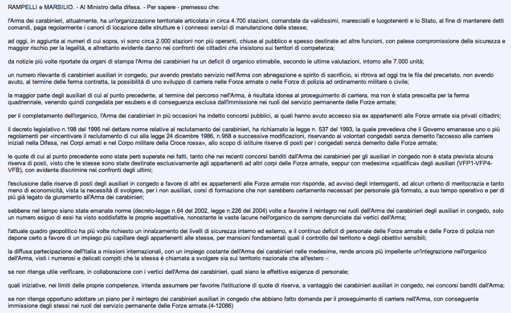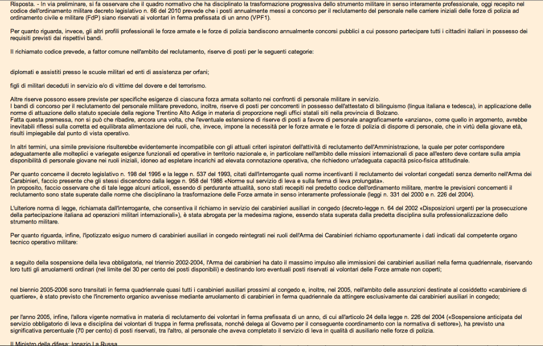 In sostanza analizzando la risposta del ex ministro viene citato in primis il quadro normativo professionale , cioè una totale trasformazione in un esercito di professionisti. Ma di fatto cosa erano i carabinieri ausiliari forse professionisti non riconosciuti? successivamente l’ex ministro cita le esigenze tecnico operative all’estero , menzionando una giovane età degli operanti : “Fatta questa premessa, non si può che ribadire, ancora una volta, che l’eventuale estensione di riserve di posti a favore di personale anagraficamente «anziano», come quello in argomento, avrebbe inevitabili riflessi sulla corretta ed equilibrata alimentazione dei ruoli, che, invece, impone la necessità per le forze armate e le forze di polizia di disporre di personale, che in virtù della giovane età, risulti impiegabile dal punto di vista operativoIn altri termini, una simile previsione risulterebbe evidentemente incompatibile con gli attuali criteri ispiratori dell’attività di reclutamento dell’Amministrazione, la quale per poter corrispondere adeguatamente alle molteplici e variegate esigenze funzionali ed operative in territorio nazionale e, in particolare nell’ambito delle missioni internazionali di pace all’estero deve contare sulla ampia disponibilità di personale giovane nei ruoli iniziali, idoneo ad espletare incarichi ad elevata connotazione operativa, che richiedono un’adeguata capacità psico-fisica attitudinale. ” , su questa affermazione ci riserviamo di rispondere ma vorremmo solo ricordare che la media dei carabinieri ausiliari si aggira sui 30 anni, ma per l’ex ministro e lo stato si è anagraficamente “anziani” per la carriera militare e allo stesso tempo anagraficamente “giovani” per lavorare, tuttavia stà di fatto che nelle “missioni” vi è personale in servizio con ben oltre 40anni di età. Di seguito viene citato dall’ex ministro il codice dell’ordinamento militare ove si può chiaramente notare, come non venga più menzionata una categoria che ha prestato il proprio aiuto alla nazione escludendola di fatto dall’ordinamento stesso. Infine vengono citati i dati indicati dal competente organo tecnico operativo militare: “a seguito della sospensione della leva obbligatoria, nel triennio 2002-2004, l’Arma dei carabinieri ha dato il massimo impulso alle immissioni dei carabinieri ausiliari nella ferma quadriennale, riservando loro tutti gli arruolamenti ordinari (nel limite del 30 per cento dei posti disponibili) e destinando loro eventuali posti riservati ai volontari delle Forze armate non coperti; nel biennio 2005-2006 sono transitati in ferma quadriennale quasi tutti i carabinieri ausiliari prossimi al congedo e, inoltre, nel 2005, nell’ambito delle assunzioni destinate al cosiddetto «carabiniere di quartiere», è stato previsto che l’incremento organico avvenisse mediante arruolamento di carabinieri in ferma quadriennale da attingere esclusivamente dai carabinieri ausiliari in congedo; per l’anno 2005, infine, l’allora vigente normativa in materia di reclutamento dei volontari in ferma prefissata di un anno, di cui all’articolo 24 della legge n. 226 del 2004 («Sospensione anticipata del servizio obbligatorio di leva e disciplina dei volontari di truppa in ferma prefissata, nonché delega al Governo per il conseguente coordinamento con la normativa di settore»), ha previsto una significativa percentuale (70 per cento) di posti riservati, tra l’altro, al personale che aveva completato il servizio di leva in qualità di ausiliario nelle forze di polizia. ” , a questo si potrebbe rispondere replicando che non vi è logica nel destinare solo il 30% a personale operativo già formato, se poi ci si aggiunge che come citato dall’ex ministro “nel biennio 2005-2006 sono transitati in ferma quadriennale quasi tutti i carabinieri ausiliari prossimi al congedo e, inoltre, nel 2005, nell’ambito delle assunzioni destinate al cosiddetto «carabiniere di quartiere», è stato previsto che l’incremento organico avvenisse mediante arruolamento di carabinieri in ferma quadriennale da attingere esclusivamente dai carabinieri ausiliari in congedo” il quesito sorge spontaneo: e il personale congedato senza demerito con idoneità prima del biennio che non è mai riuscito a vincere il concorso interno, vuoi per l’irrisorio numero di posti riservati a concorso, vuoi per l’elevato numero di partecipanti, perché non è stato considerato? A conclusione l’ex ministro cita la legge 226 del 2004 che come analizzeremo , menziona una riserva di posti sino al 70% per il personale proveniente dai ruoli ausiliari delle forze di Polizia e Arma dei Carabinieri, il concorso permetteva di fare 1 anno di servizio come Volontario nelle forze armate e successivamente rifare un ennesimo concorso interno per poter transitare nell’Arma dei Carabinieri, Polizia di Stato o rimanere nei ruoli dell’Esercito. Certo è che per un carabiniere con 1- 2 o 3 anni di servizio vincitore di concorso ma congedato per carenza di posti , arruolarsi nuovamente per 1 anno e rischiare di nuovo di essere congedato significherebbe ricadere nel baratro della disoccupazione e del precariato militare, ma la professionalità del carabiniere con 1 -2- 3 anni di servizio come viene considerata? non viene presa affatto in considerazione leggendo i sopracitati bandi di arruolamento e leggi emanate, lo stesso stato potrebbe reintegrare il personale già formato con un decreto legge immediato grazie l’art. 77 della costituzione: “Quando, in casi straordinari di necessità e di urgenza, il Governo adotta, sotto la sua responsabilità, provvedimenti provvisori con forza di legge, deve il giorno stesso presentarli per la conversione alle Camere che, anche se sciolte, sono appositamente convocate e si riuniscono entro cinque giorni [cfr. artt. 61 c. 2, 62 c. 2] I decreti perdono efficacia sin dall’inizio, se non sono convertiti in legge entro sessanta giorni dalla loro 